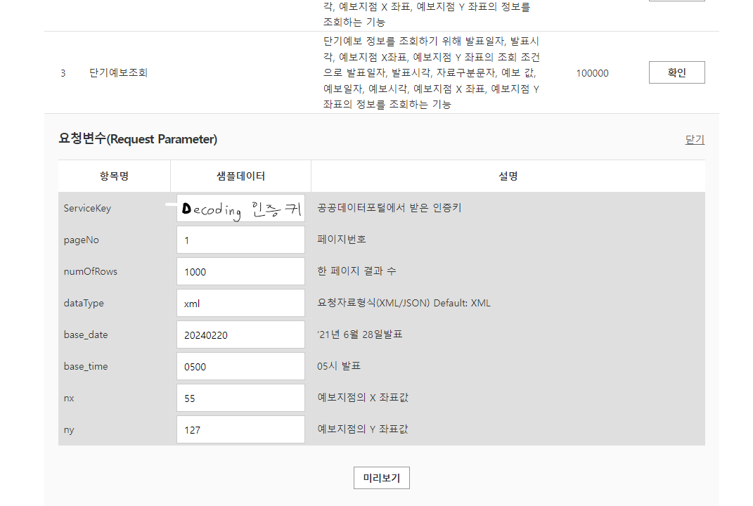 그 중에서 단기예보조회에서 내 일반 인증키(Decoding)를 ServiceKey에 입력하고 미리보기를 눌렀다.