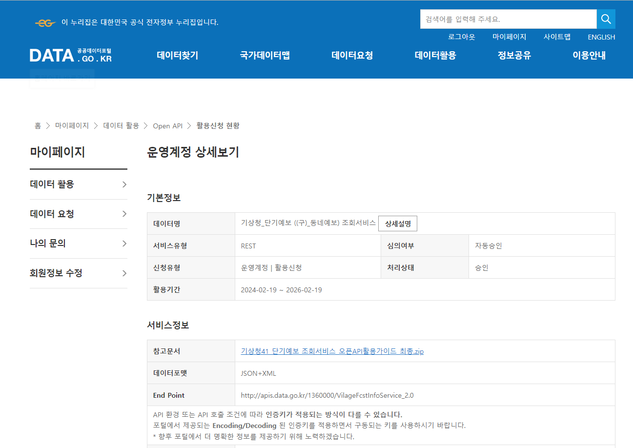 찾아보다 '기상청_단기예보 ((구)_동네예보) 조회서비스' API를 신청하였다.
