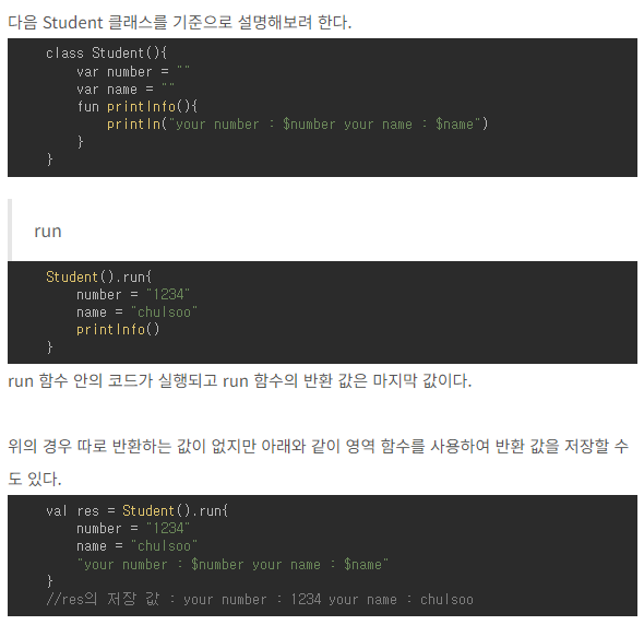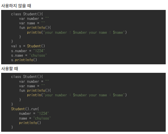 - run은 확장 함수가 아니고, 블럭에 입력값도 없다. 따라서 객체를 전달받아서 속성을 변경하는 형식에 사용되는 함수가 아니다.