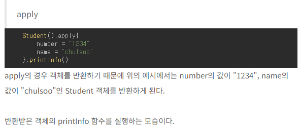 apply는 T의 확장 함수이고, 블럭 함수의 입력을 람다 리시버로 받았기 때문에 블럭 안에서 객체의 프로퍼티를 호출할 때 it이나 this를 사용할 필요가 없다. run과 유사하지만 블럭에서 return 값을 받지 않으며 자기 자신인 T를 반환한다는 점이 다르다.