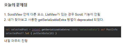 1. Scroll안에 listView를 배치했었는데 문제점과 사용을 권장하지 않는다하여 따로 배치로 해결하였다.